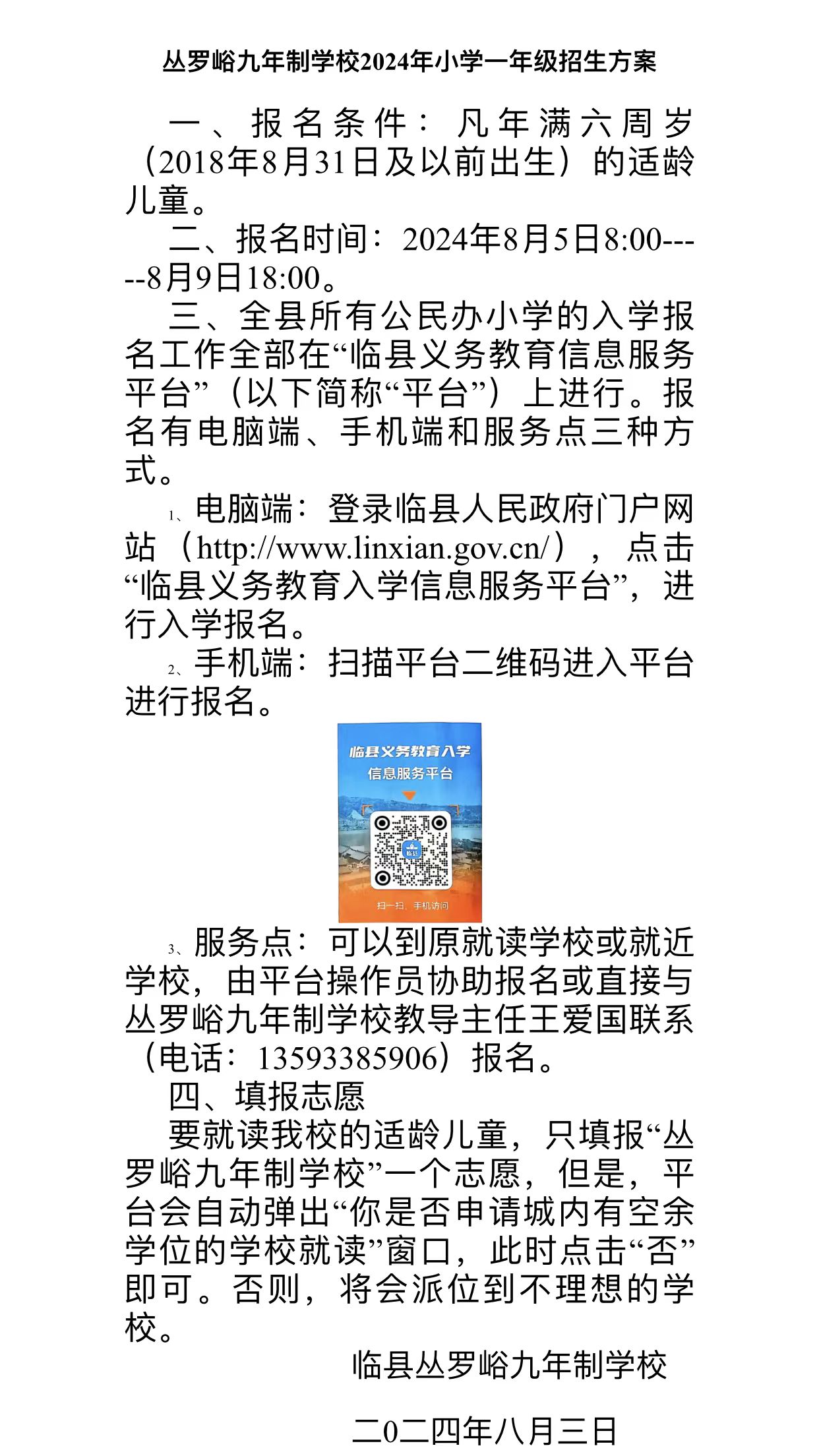 要就读我校的适龄儿童,只填报“丛罗峪九年制学校”一个志愿,但是,平台会自动弹出“你是否申请城内有空余学位的学校就读”窗口,此时点击“否”即可。否则,将会派位到不理想的学校。
